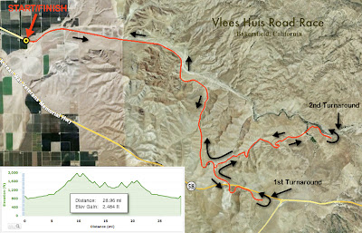 The 2nd De Vlees Huis Road Race was scheduled for Saturday April 9th 2011 and there was a category for 55 and 60+ racers. There was a scheduling conflict in 2010 with the Torrance Criterium so the attendance wasn't that great but in 2011 the race had an open date. The location is 15 miles outside of Bakersfield on Hwy 58 which goes to Lake Isabella. I was quite surprised when I got on the course to see that there are many beautiful spots along the way with a river along the course and under the parts of the road way. No oil wells. Open space and ranch land though I didn't see any cattle. The course is 29 miles for one lap and gains 2400 ft. in that lap. No grade is over 8 or 9 present. There is some pretty rugged looking terrain just north of us. The course takes you into a valley at the second turnaround where you can see the river. Lots of water this time of year. I forgot to put my road cluster on and did it in my crit cluster which is 11/21 and didn't have a problem. Great looking and challenging course. Of course road racers love it but bigger riders with lots of sustained power can do it well. The 55/60+ group was to do one lap. The start time was 8:20 am.