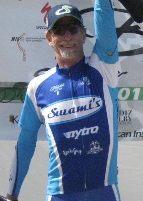 Gary Shuey came across the finish line for the 1st rider in and the 55+ winner. Nice job, Grasshopper! The 3 other adventurers were also going to stay ahead of the pack. Don't think you could say there was a sprinter in the small group but here they came for the finish line. Tom Reilly bested everyone for 2nd place followed in by Steve Borer and Craig Jones. The pack was setting up for the field sprint with Santa Clarita Velo's Kirk Freeman on duty up front. Fred "The General" Hoblit was shouting orders to Kirk several riders back. The orders were the same every time. Go faster! The new course that Chris came up with is similar to the old one but slightly harder with a stinger hill between turn 3 and 4. After turn 3 it heated up with Mike Birditt, Fred Hoblit, Ricky Shorts, and Bob Wright shooting forward. Monty Pettus was right in the mix. I decided to stay on Monty's wheel this day. Tired of having trouble with bad "wheels" on the last lap. Monty knows what he is doing so I just stayed on him. Coming around the last corner the front mix was the same. Bob Wright was on his teammate, "The General" and whizzed by Monty and myself just before the last corner on the outside. Bob is very close in BAR points with Rich Stahlberg who was right behind me. Bob was looking good for a possible win in 60+.